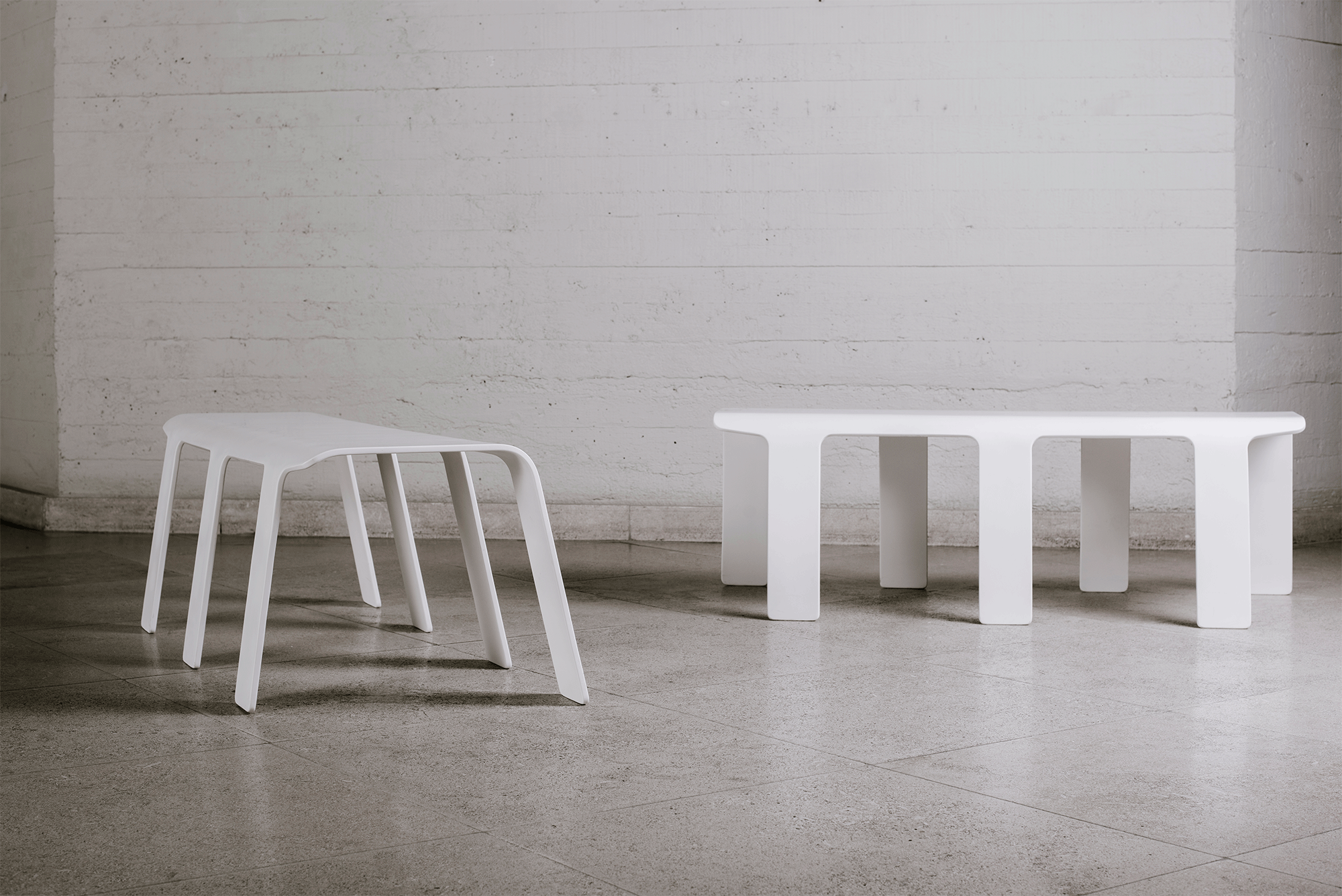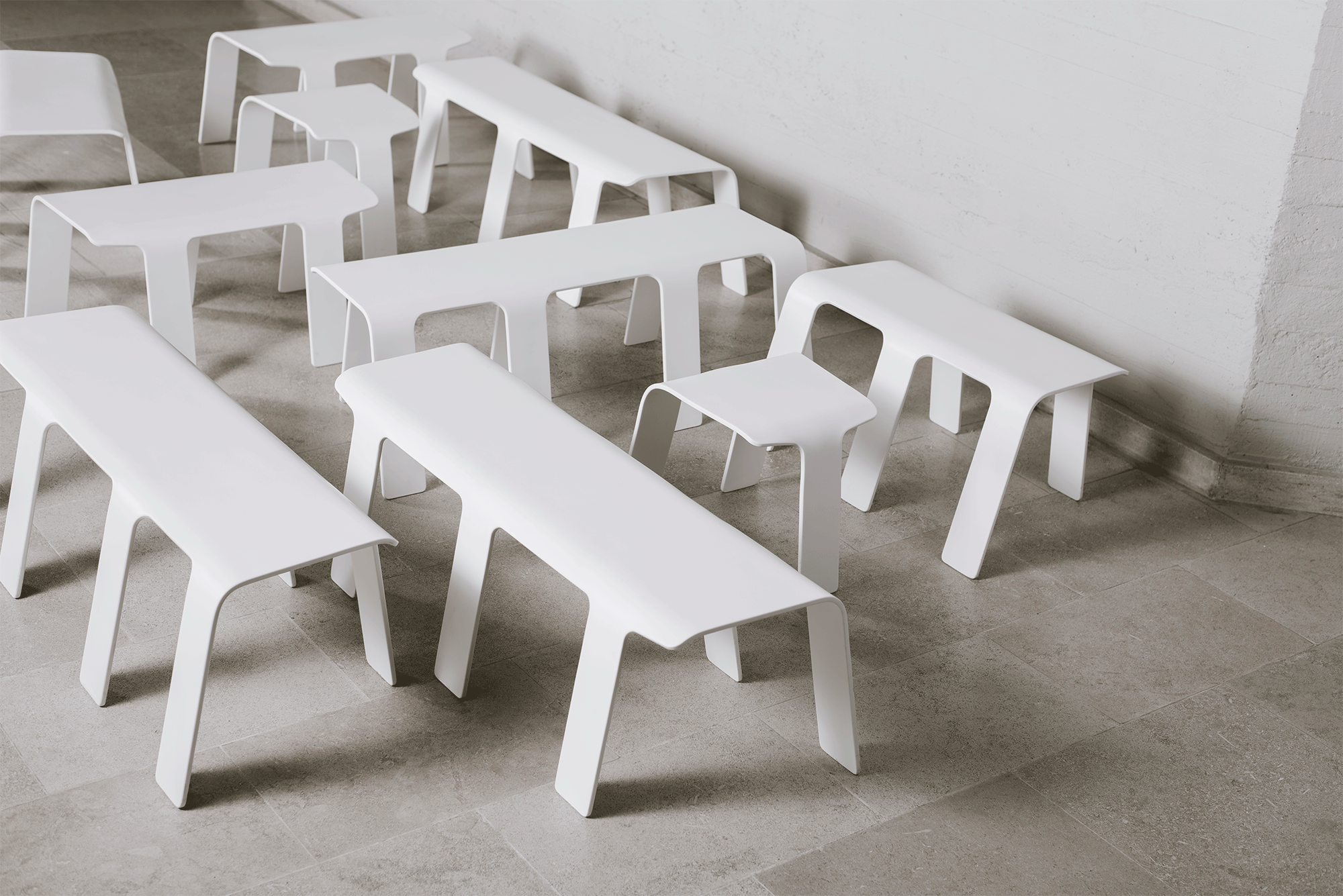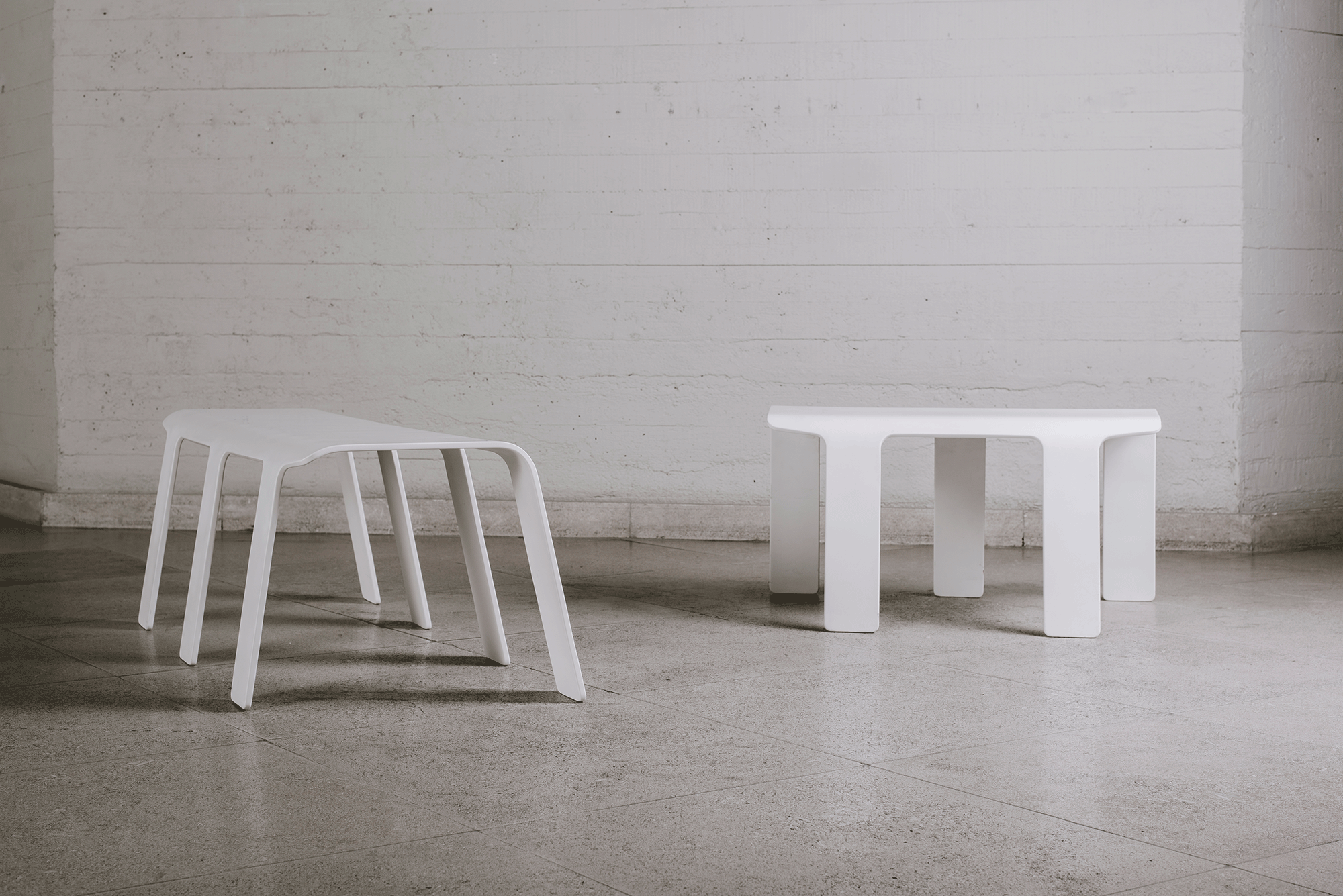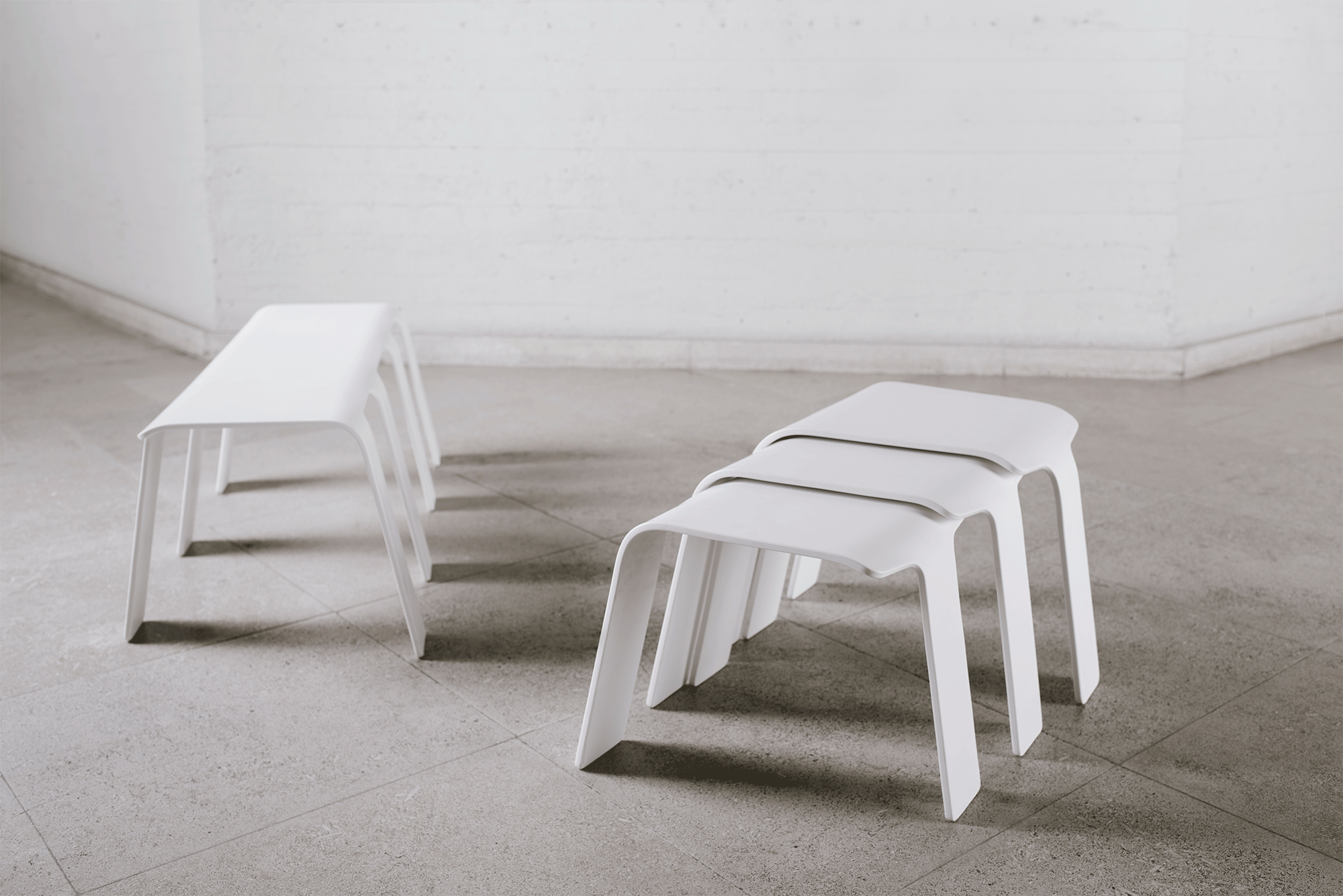 La gamme « Fold » est un ensemble de pièces de mobilier en Corian, composée de trois tables gigognes, d’un banc pour deux personnes et d’un banc pour trois personnes. Aux courbes et à la ligne sobre, ils bousculent légèrement les codes par leur asymétrie.Formée d’un seul tenant, chaque pièce est réalisée dans une seule feuille de Corian.