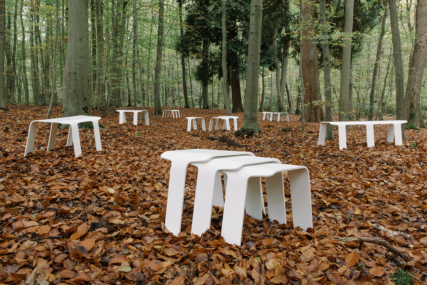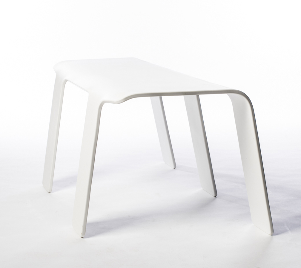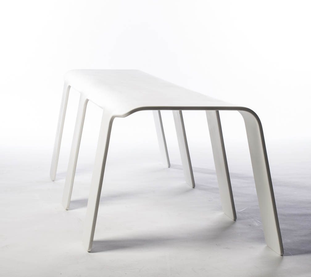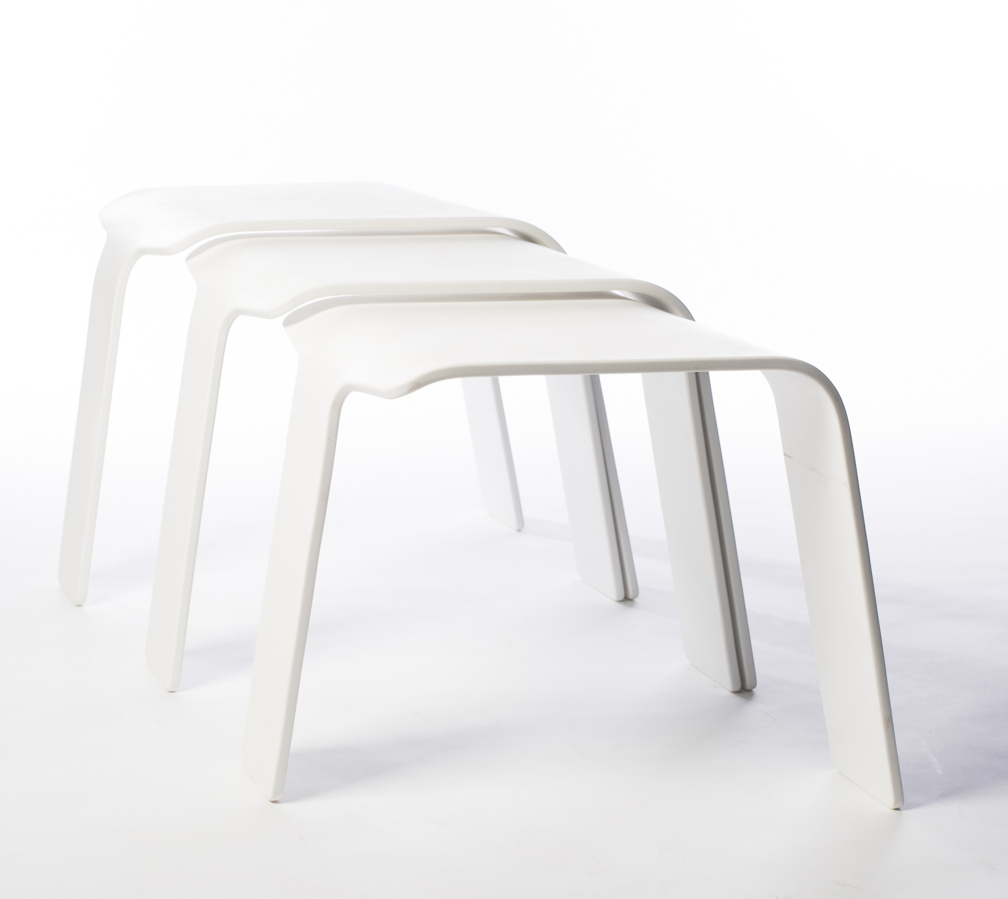 La gamme « Fold » est un ensemble de pièces de mobilier en Corian, composée de trois tables gigognes, d’un banc pour deux personnes et d’un banc pour trois personnes. Aux courbes et à la ligne sobre, ils bousculent légèrement les codes par leur asymétrie.Formée d’un seul tenant, chaque pièce est réalisée dans une seule feuille de Corian.